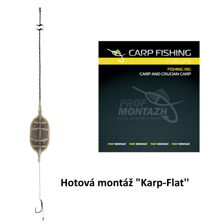 Hotová montáž Carp-Flat (1 háček) – hotová montáž s plochým krmítkem je klasickým řešením v moderním method feederu. Montáž je sestavena z kvalitního olověného návazce Climax (Germany), který zabraňuje překroucení, nepoškozuje rybu při zdolávání a chrání montáž před poškozením o mušle nebo kameny.