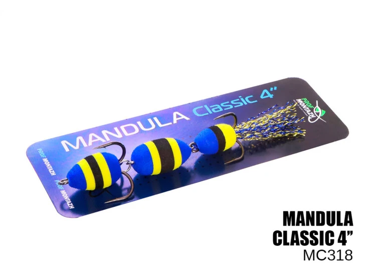 Mandula Classic 3 segmenty 100mm (#318) – má nejširší paletu – 152 kontrastních, dvou a tří barevných kombinací, umožňuje vybrat si mandulu pro jakýkoli vkus a podmínky lovu dravců. Vyrobeno ze 3 segmentů proudnicového tvaru. Dnes se tento tvar těla již stal klasikou a byl testován miliony rybářů po celém světě. Celková délka 10 cm je univerzální střední velikost, dobře se hodí pro lov různých dravců: candáta, štiky, okouna, sumce a dokonce i osina. Osazeno dvěma ostrými odpališti čísel 2 a 4. Trim na ocasu je vyroben z kvalitního dvoubarevného lurexu, který je ve fázi výroby manduly navíc ručně načechraný. Nástraha funguje dobře jak na stojatých vodách, tak i v proudu. Není nijak náročná na druh zátěže (skládací Cheburashka, Jig – Rig, Dancing – Rig a další). Díky proudnicovému tvaru těla umožňuje lovit na velké vzdálenosti, kde ryby z velké části nejsou tak bázlivé a ostatní rybáři je netlačí.