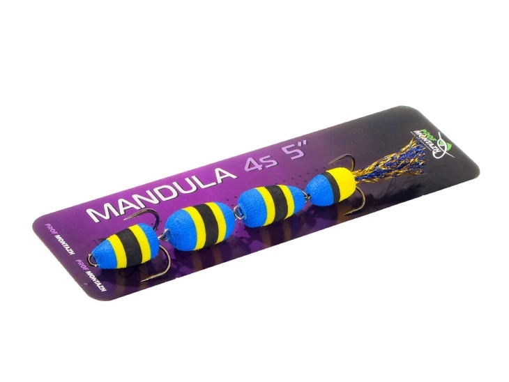 Mandula 4S 5″ 125mm (#901) – skládá se ze 4 částí těla, které poskytují vynikající hravost nástrahy, je vybavena dvěma ostrými odpališti číslo 2 a 4. Ocas mandulky je opatřen barevným lurexovým lemem.