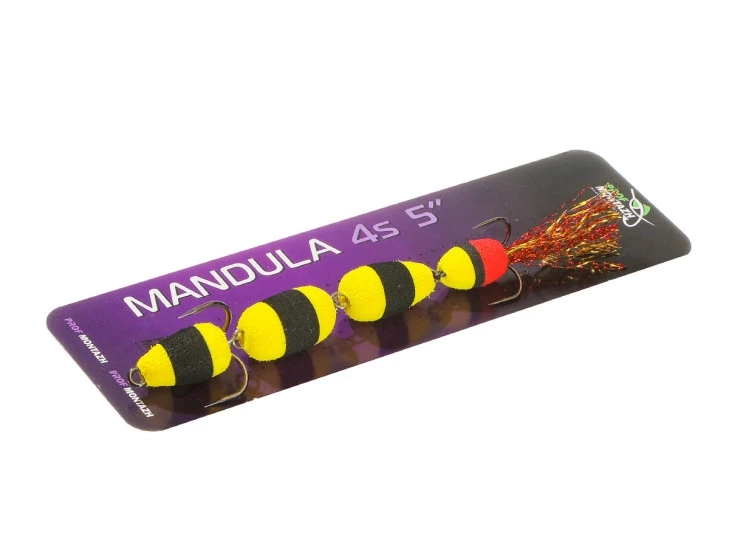 Mandula 4S 5″ 125mm (#909) – skládá se ze 4 částí těla, které poskytují vynikající hravost nástrahy, je vybavena dvěma ostrými odpališti číslo 2 a 4. Ocas mandulky je opatřen barevným lurexovým lemem.