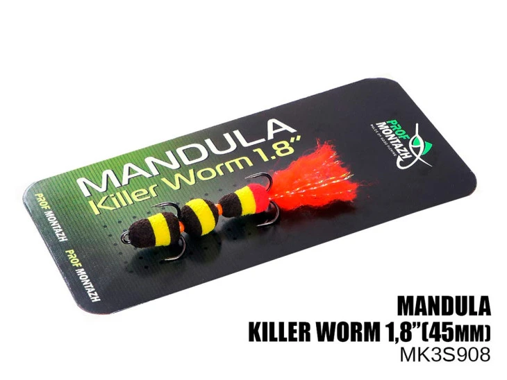 Mandula Killer Worm 3 segmenty 45mm (#908) – nejmenší z řady Killer Worm, tělo je tvořeno 3 malými segmenty, každý díl je rozdělen korálky, celková délka mandulky je pouze 45mm. Toto je skutečný nález pro rybolov microjig. Trofejemi tohoto drobečka jsou především okouni a candát se štikou, ale zejména na jaře dobře láká karasy a kapry, svou hrou připomíná tak žádaného červa.