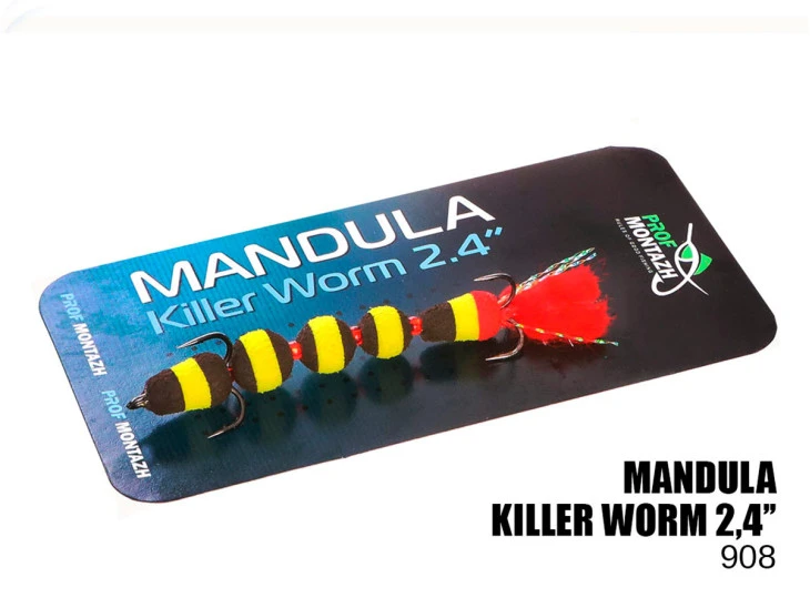 Mandula Killer Worm 5 segmentů 60mm (#908) – největší mandulka ze série Killer Worm, tělo je tvořeno 5 segmenty, každý díl je oddělen korálky, celková délka mandulky je 60mm. Díky své vícedílné sekci předvádí „zabiják“ velmi živou hru a jasně reaguje na všechny akce rybáře. Killer Worm 2,4″ perfektně svádí okouny, candáta i štiky a je nepostradatelnou nástrahou při lehkém lovu na vrtošivé ryby. Dobře funguje klidná kroková animace bez prudkého náhozu, pro velmi pasivní ryby se vyplatí použít přetahování s pauzami.