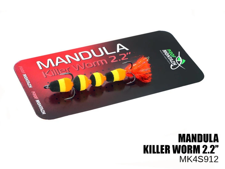 Mandula Killer Worm 4 segmenty 55mm (#912) – tělo se skládá ze 4 segmentů, každá část je oddělena korálky, celková délka mandulky je 55mm. V řadě Killer Worm se jedná o středně velkou mandulu, skvělou jak pro microjig, tak pro lehký lov. Za prvé, trofejí této mandule jsou okouni, ale candáti a štice se také nebrání hodovat na tak chutné napodobenině červa.