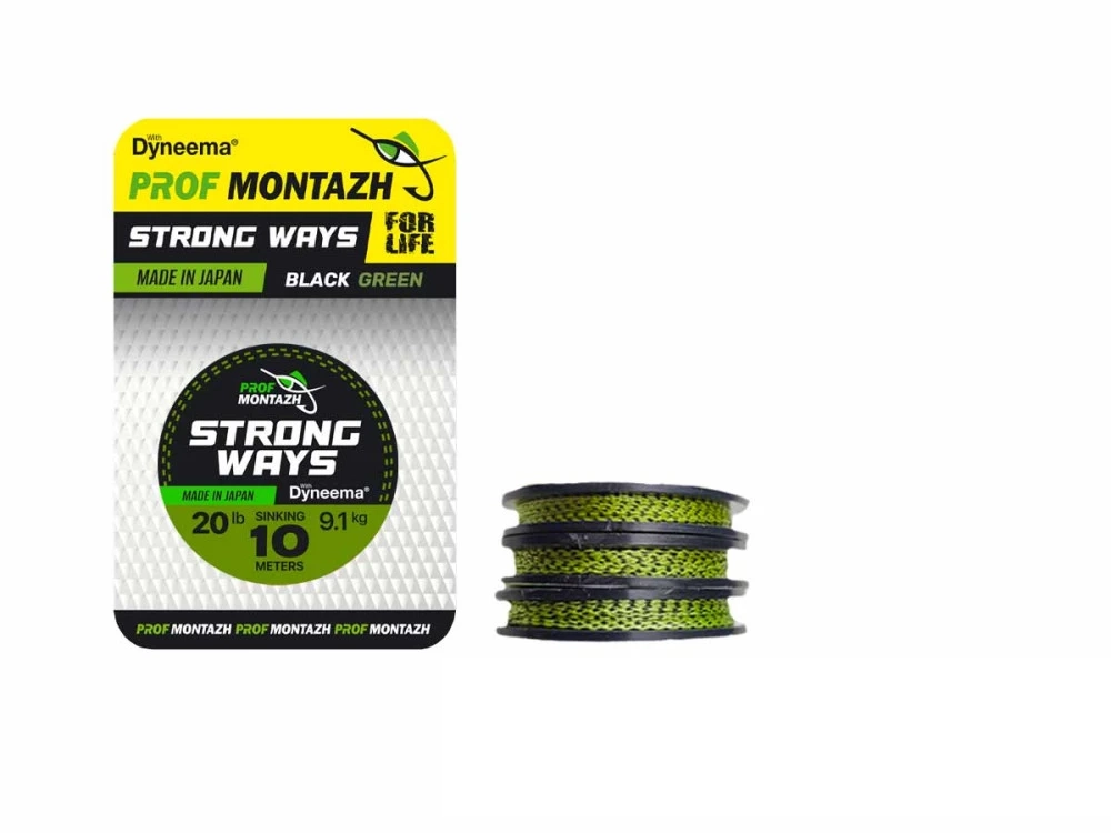 STRONG WAYS Black Green 20 LB 9,1 kg (10 m) – vyrobeno z kvalitních vláken Dyneema vyrobených v Japonsku. Vyznačuje se vysokou odolností proti oděru, trvanlivostí, měkkostí a pevností v uzlech. Hlavní účel – jedná se o samostatnou výrobu návazců pro kapry na vlasové jigy, pro karasy na různá krmítka a zabijáky karasů. V nabídce jsou 3 maskovací barvy: černá zelená, černá žlutá, černá hnědá a 4 průměry 15lb, 20lb, 25lb a 30lb. Díky tomuto výběru nebude mít každý rybář problém přizpůsobit materiál návazce podmínkám rybolovu a očekávaným trofejím, což rybáři umožní realistickou prezentaci nástrahy.