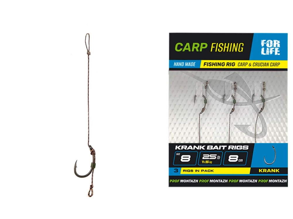 Hotový bojlový návazec KRANK BAIT RIGS – vybavený oblíbeným modelem háčku KRANK. Háček je vyráběn na zakázku v továrně Kumho (Korea) a vyznačuje se výjimečnou ostrostí a spolehlivostí. Speciální PTFE povlak spolehlivě chrání háček před korozí a pomáhá mu zůstat ostrý po dlouhou dobu. Zvláštní zakřivený tvar háčku zajišťuje nejen vynikající realizaci záběrů, ale také spolehlivé držení ryby během celého procesu vytahování. Vlasec KRANK BAIT RIGS je vhodný pro všechny typy návnad: pop-upy, boilery, waftery, vyvážené návnady (balance), imitace kukuřice atd. Vlasec je vyroben z kvalitního, měkkého vlascového materiálu Climax (Německo) s přetržnou zátěží 25 lb.