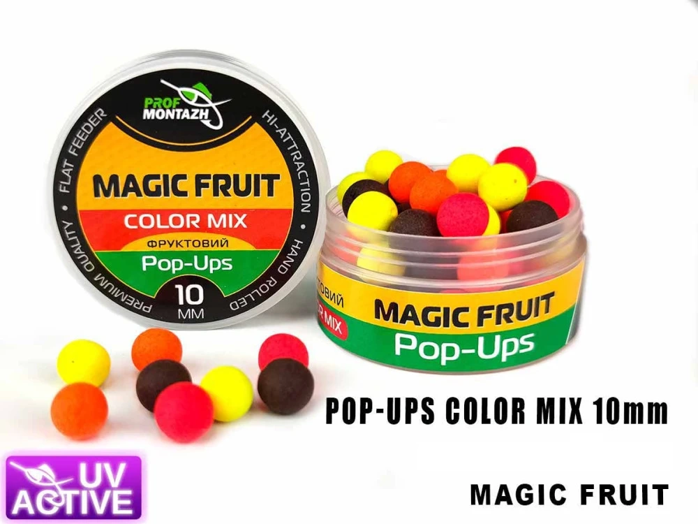 Boilies POP-UPS Ovocný COLOR MIX (MAGIC FRUIT) 10mm – jsou vyrobeny z originální vysoce kvalitní směsi vlastní receptury, která se skládá z přírodních ingrediencí a aminokyselin. Pop-up je samostatně účinnou nástrahou. Atraktant – unikátní ovocný mix, který vydává silný potravní signál.
