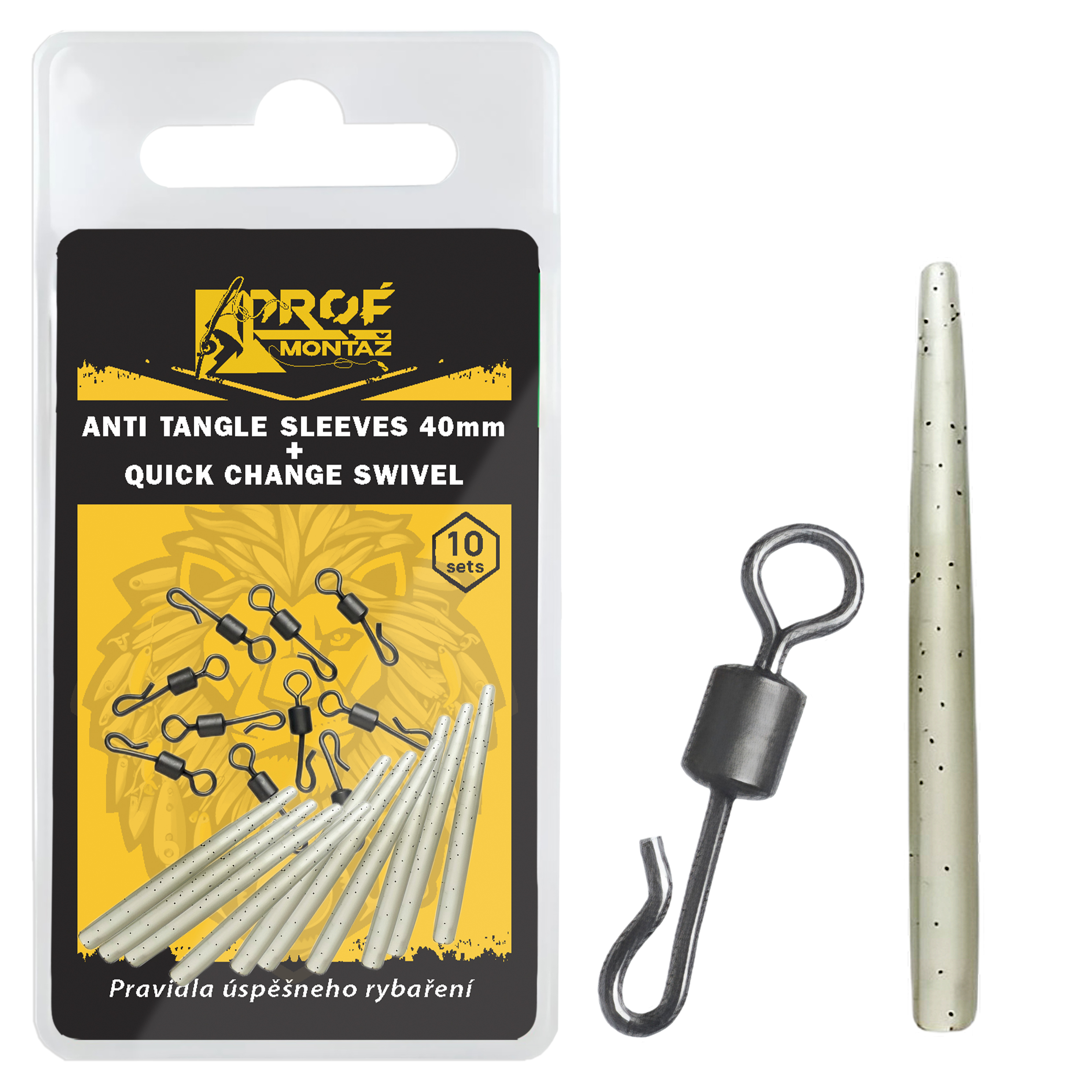 Sada převleky proti zamotání a rychlovýměnný obratlík Ideální sada pro montáž. Převlek proti zamotání zabraňují zamotání návazce a rychlovýměnný obratlík v matné barvě nezbytné pro rychlou výměnu návazců.
