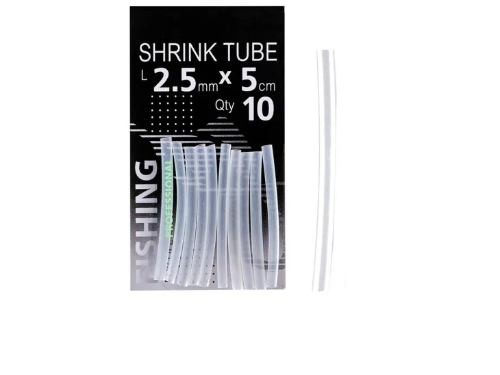Smyršťovací trubička průhledná D-2,5 mm, L-5 cm (10 ks) – určena k fixaci uzlů a spojů, široce využívána při vázání vlasových montáží, kde vytváří ochrannou bužírku na háčku a správně jej orientuje.