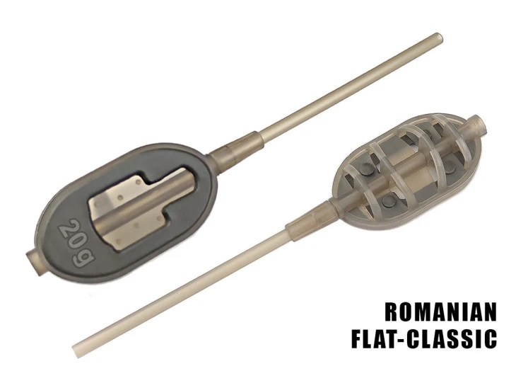 Krmítko Romanian Flat se liší od běžných flatových krmítek přítomností dlouhé trubičky v přední části. Tato trubička chrání montáž před překroucením a stabilizuje krmítko při náhozu, což umožňuje velmi daleké a přesné hody. Je vyrobeno z vysoce kvalitního primárního plastu, zátěž je spolehlivě upevněna nýty. Nejlépe se používá Flat – Classic s nástrahami malé a střední velikosti: hnojní červ, kukuřice, hrách, tygří ořech, pop-upy a boilies 10 mm. Hodí se pro použití jak s klasickými krmnými směsmi, tak s peletami, návnada dobře drží bez ohledu na vzdálenost či podmínky lovu. Díky spodnímu umístění zátěže dopadá na dno vždy tak, že nástraha s krmením směřuje nahoru, a zůstává tak rybě dobře dostupná.