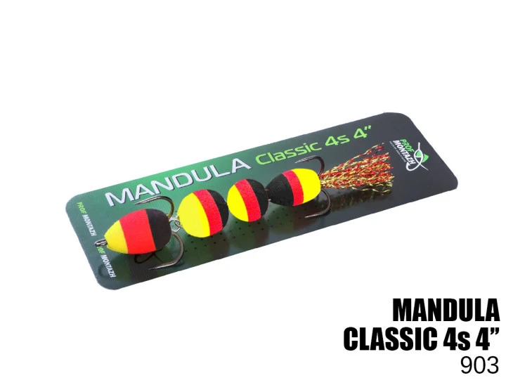 Mandula Classic 4S 4″ (#903) – skládá se ze 4 kulovitých segmentů – to zajišťuje návnadě zvýšenou pohyblivost ve vodě. Je vybavena dvěma ostrými odpališti čísel 2 a 4. Okraj na ocásku je vyroben z kvalitního lurexu, který je ve fázi výroby manduly navíc ručně povolován.
