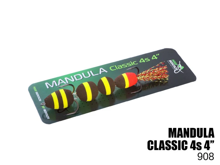 Mandula Classic 4S 4″ (#908) – skládá se ze 4 kulovitých segmentů – to zajišťuje návnadě zvýšenou pohyblivost ve vodě. Je vybavena dvěma ostrými odpališti čísel 2 a 4. Okraj na ocásku je vyroben z kvalitního lurexu, který je ve fázi výroby manduly navíc ručně povolován.