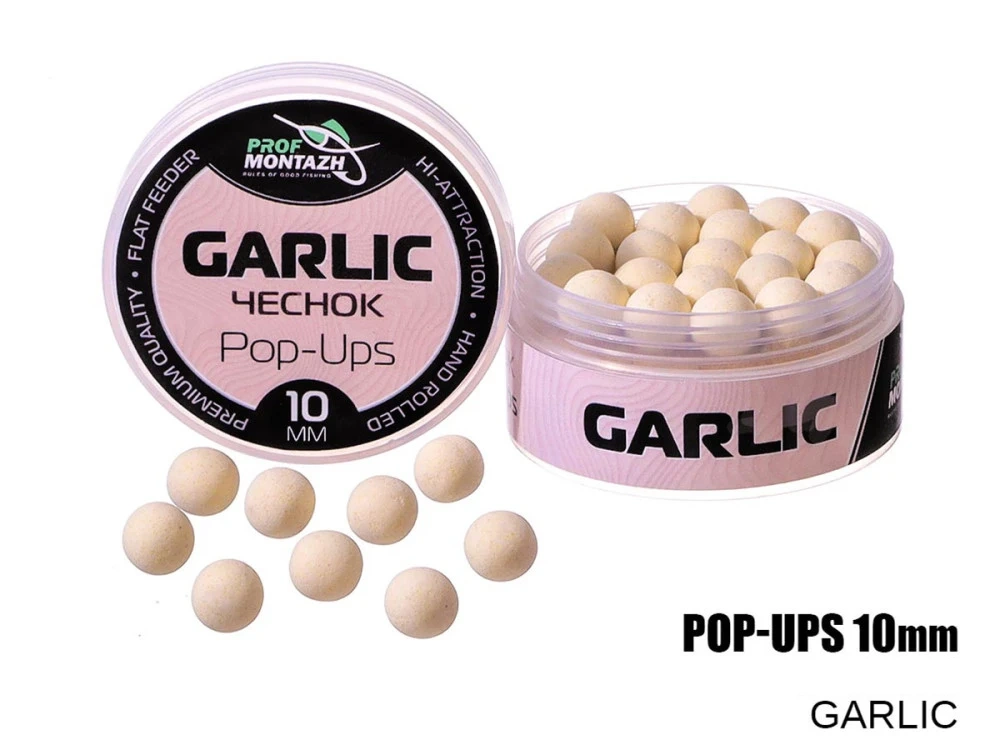 Boilies POP UPS – Česnek (Garlic) 10 mm – jsou vyráběny z vysoce kvalitní směsi vlastní receptury, která se skládá z přírodních ingrediencí a aminokyselin evropských značek. Jasné barvy pop-upu dokonale zvýrazňují nástrahu na pozadí dna a krmení. Obsahují UV pigment, díky čemuž svítí pod ultrafialovým světlem a jsou obzvláště účinné při rybolovu za zataženého počasí, v hloubkách nad 3 metry a v kalné vodě.