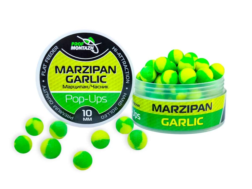 Boilies POP UPS – Marcipán/Česnek (Marzipan/Garlic) 10 mm – jsou vyráběny z vysoce kvalitní směsi vlastní receptury, která se skládá z přírodních ingrediencí a aminokyselin evropských značek. Jasné barvy pop-upu dokonale zvýrazňují nástrahu na pozadí dna a krmení. Obsahují UV pigment, díky čemuž svítí pod ultrafialovým světlem a jsou obzvláště účinné při rybolovu za zataženého počasí, v hloubkách nad 3 metry a v kalné vodě.