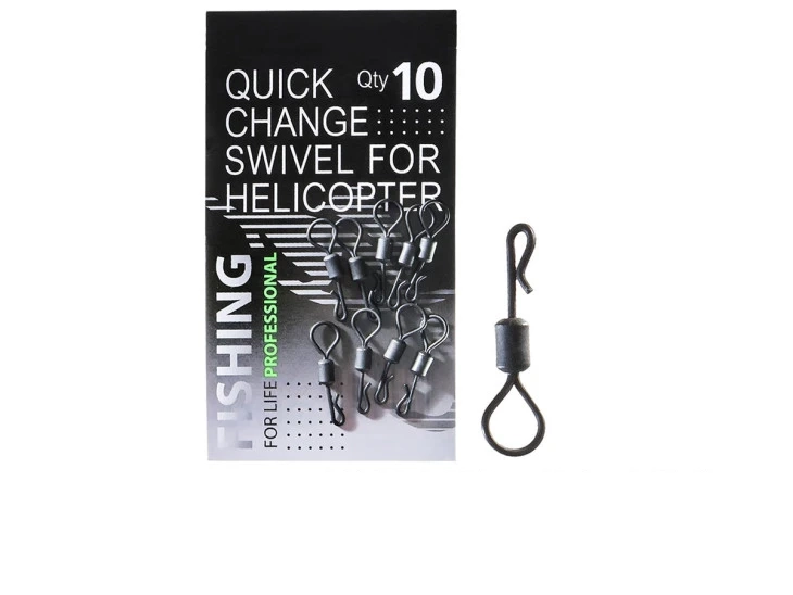 Rychlovýměnný obratlík pro helikoptéru (10 ks) – vyroben z vysoce kvalitní oceli, má PTFE povrchovou úpravu, která chrání proti korozi a neodráží světlo. Určen pro rychlou výměnu návazců, používá se spolu s gumovým odklonem. Díky zvětšenému průměru očka volně klouže po olověnce, nezadrhává se a nezamotává se.