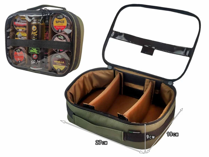 Praktická rybářská taška s průhledným víkem má 2 nastavitelné přepážky, které vytvářejí 3 oddíly. Taška je ideální pro přepravu a skladování různých doplňků, nástrah, boilies, boosterů atd. pro kaprový, feederový nebo plavaný rybolov.