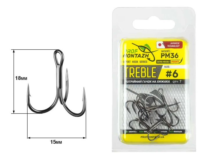 Celá série trojháčků PM36 zahrnuje 6 velikostí – od čísla 2 do 12. Snadno si tak vyberete vhodný háček pro své nástrahy, montáže, živé nástrahy (např. při lovu na položenou) a další rybářské potřeby.